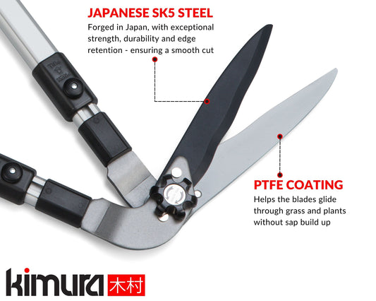 Kimura Pro Telescopic Hedge Shears, Japanese SK5 Steel Blades, Patented Gearing Technology